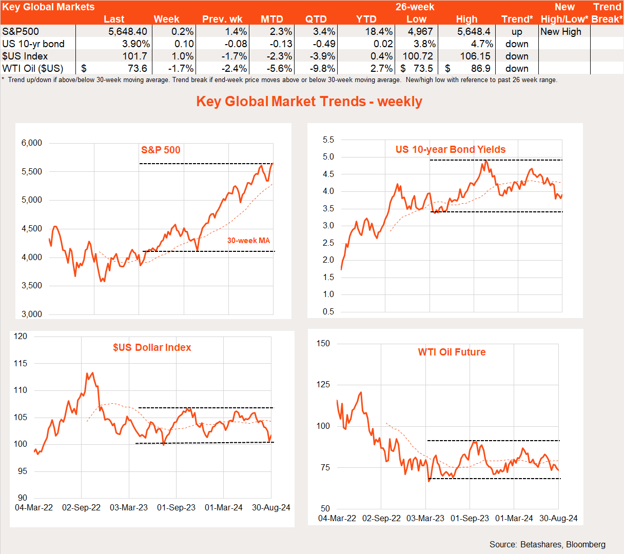 Key highlights this week are US labour market data, including job openings on Wednesday, weekly jobless claims on Thursday and the August payrolls report on Friday. With the Fed stating it no longer wants to see a further weakening in the labour market, any signs of softness would be mixed for equity markets – reintroducing fears of recession but also heightening expectations for a 0.5% Fed rate cut next month.
