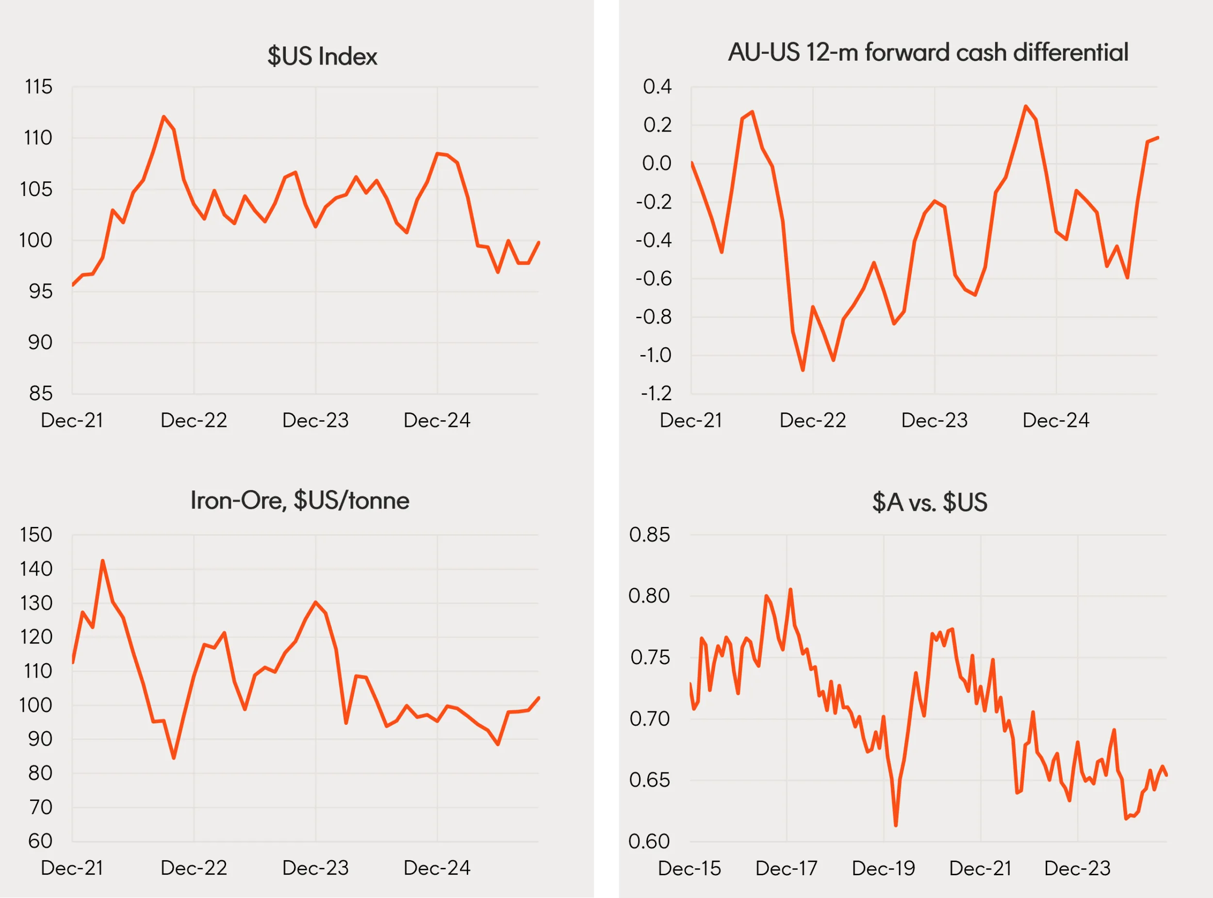 - The Australian dollar has generally been firm so far in 2025, largely reflecting weakness in the US dollar. Australian versus US short-term rate differentials have been choppy, narrowing earlier this year but widening more recently. Iron ore prices have been broadly steady, recovering a little of late after weakness earlier this year.
