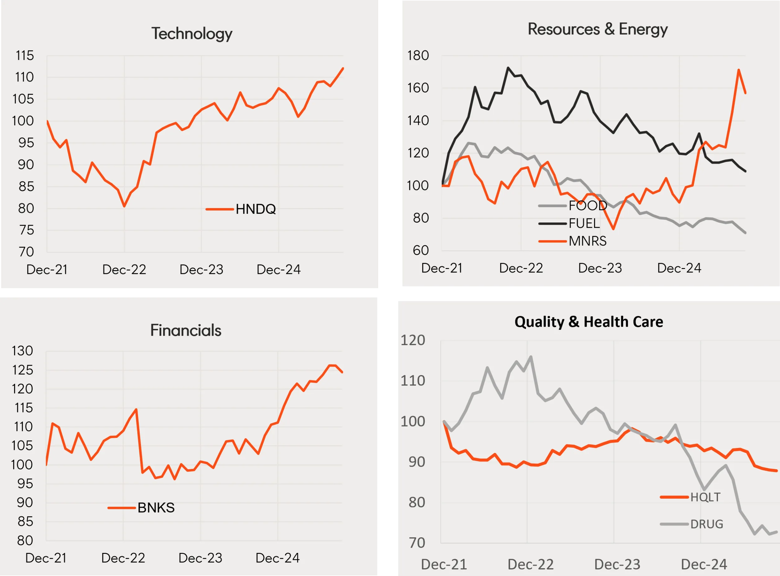 Source: Bloomberg, LSEG, Betashares. Relative performance versus the MSCI All-Country World Index (local currency terms) for the indices which the relative ETFs track. You cannot invest directly in an index. Past performance is not an indicator of future performance.