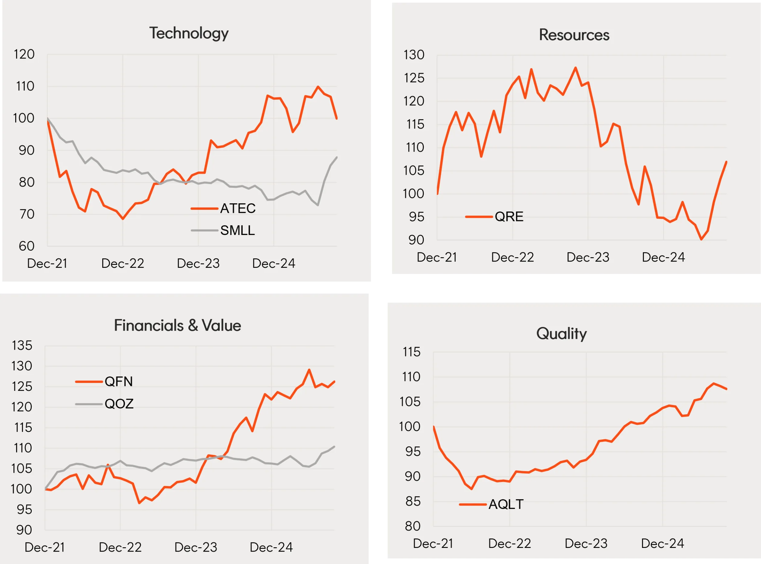 - Among select Betashares Australian equity ETFs, standout performers in the month were resources (QRE) and small caps (SMLL) with gains of 4% and 3.4% respectively. Financials (QFN) returned 1.5%.