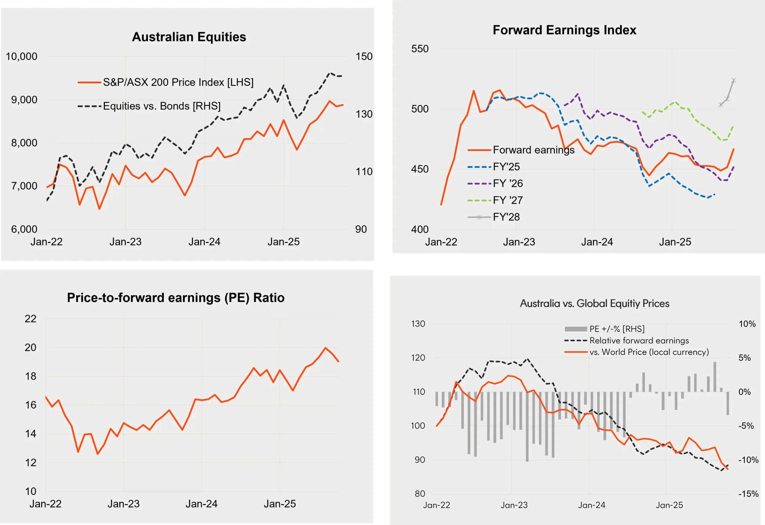 - Current earnings expectations imply 8.3% growth in Australian forward earnings by the end of 2026, which is still somewhat less than that for global earnings. Accordingly, with relative valuations fair, Australian equities still seem likely to underperform global equities over the coming year due to relatively weaker growth in earnings.