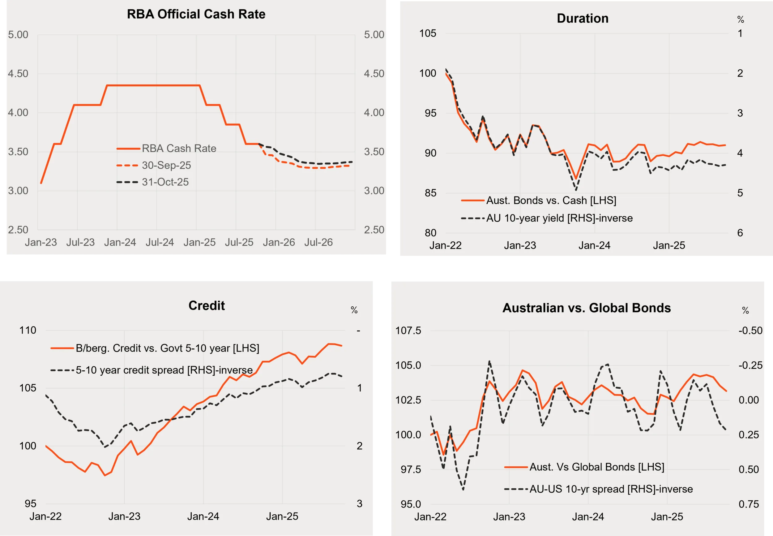 - Local rate cut expectations remains broadly unchanged over October, with mixed news over the month still leaving markets unsure whether rates would be cut in November. A higher-than-expected September quarter CPI report confirmed the inflationary pressure evident in the August monthly report, while there was also a higher-than-expected jump in the unemployment rate to 4.5%.