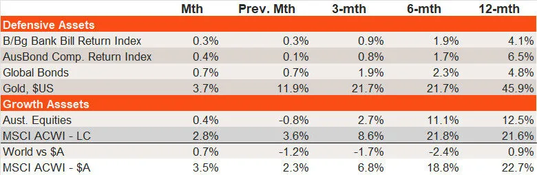 - Australian equities inched higher and underperformed global equities, despite a welcome upgrade to earnings expectations in the month.