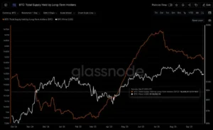 According to data from Glassnode, as of 27 September 2025 there has been a slight decline in long-term holders since July. This indicates that there has been some profit-taking occurring from around US$119K down to current levels.