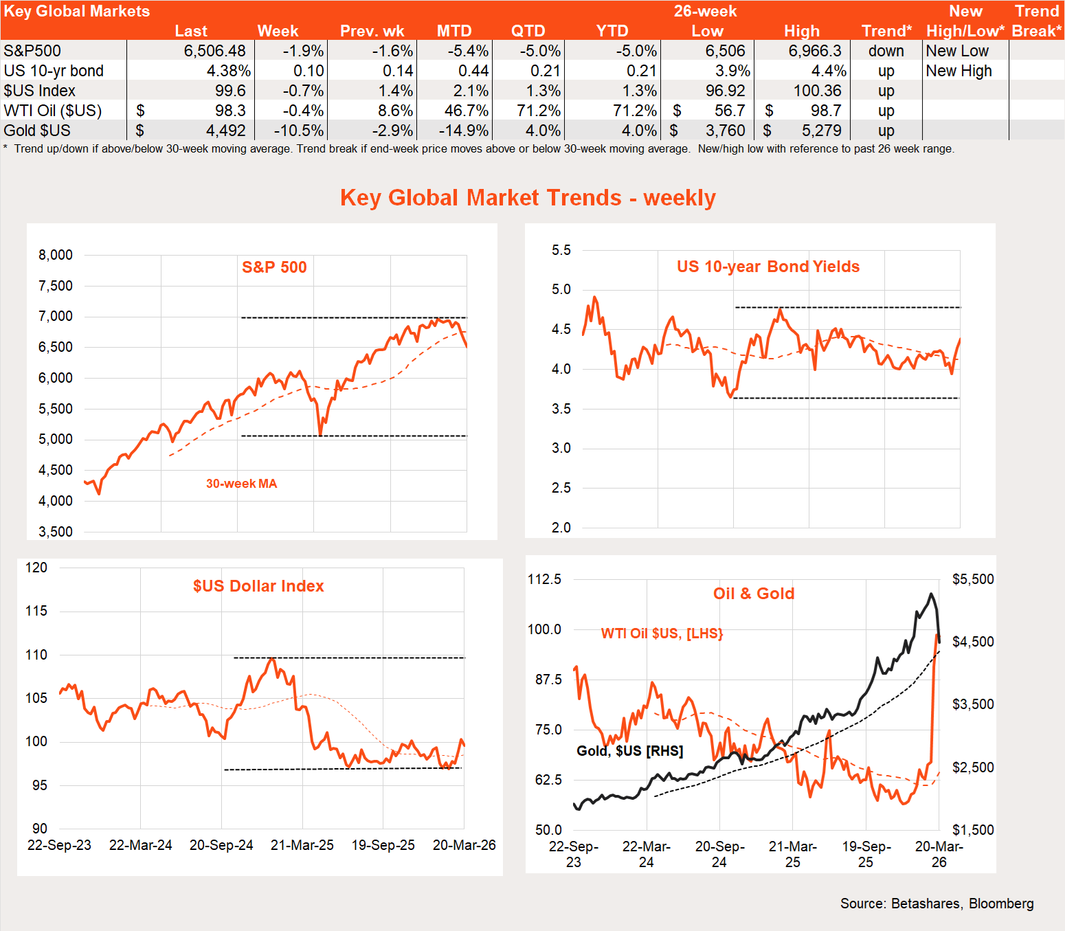 Attacks on energy infrastructure and/or further signs the US is considering “boots on the ground” could see oil prices soar, which would hurt both equity and bond markets. Due to US dollar strength and likely forced liquidation trades, gold is not proving to be a safe haven in these troubled times, with the US dollar price down 10% last week.