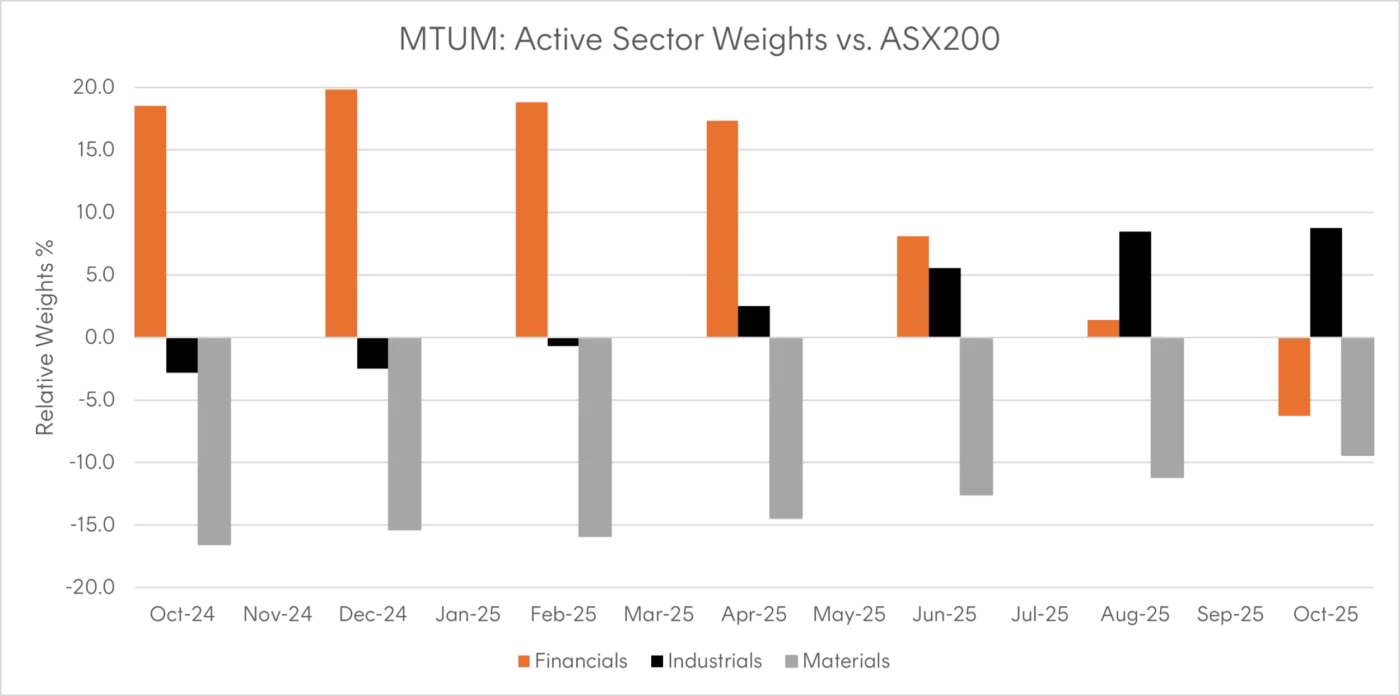 At inception, MTUM established a significant overweight in Financials, reaching nearly 20% above the sector’s representation in the S&P/ASX 200. This positioning reflected strong performance in major banks and financial stocks throughout 2024. However, since early 2025, the allocation to Financials has steadily declined and now sits below the benchmark weight. In contrast, Materials, initially the most pronounced underweight has seen a steady increase in exposure as momentum in this sector strengthened. Meanwhile, Industrials have undergone a notable shift, once underweight, the sector is now MTUM’s most active overweight position, currently sitting nearly 10% above the broader benchmark.