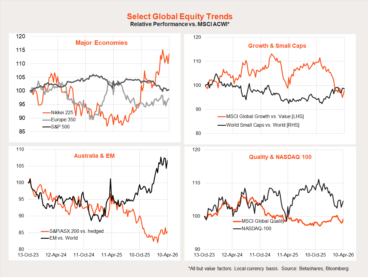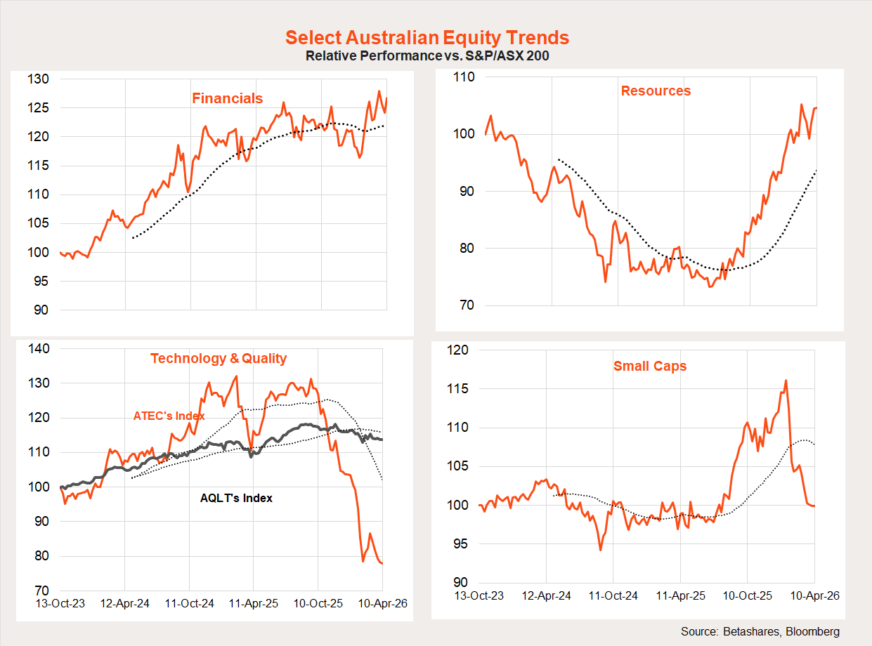 The Iran war has not been kind to high-beta local exposures such as technology and small caps. Relative performance of the larger cap resource and financial sectors has been choppy, but both have broadly held up.