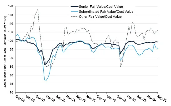 High realised losses (aka write-offs) reported by the Cliffwater Direct Lending Index (CDLI) would be the best indication, in our view, that systemic risk is unfolding in the credit markets. That is not happening. Realised losses through September 2025 have been averaging an annualised 0.68% in recent years, well below the historical 1.00% realised loss rate. Even when recent vintage loans are excluded from CDLI, realised losses have been averaging at or below historical averages.