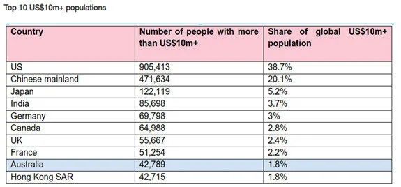 In 2024, Australia’s wealthy population was slightly ahead of Hong Kong SAR, which has 42,715 HNWIs, Italy (41,080), South Korea (39,210), Taiwan (28,391), Brazil (21,974) and Spain (21,275). The US is in first place, with almost 39% of the global US$10m+ population, nearly twice the level of China at 20.1%.2