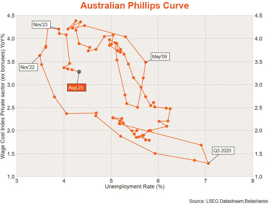 As evident in the chart below, the Phillips Curve – or the tendency of wages growth and the level of unemployment to be negatively correlated – is alive and well in Australia. The modest rise in unemployment since late 2023 (from 3.7% to 4.3%) has been associated with a slowing in annual private sector wage growth from 4.2% to 3.2%.