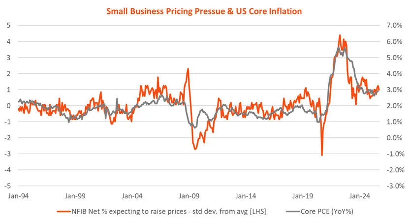 We did get further private sector data with the NFIB small business survey noting a dip in optimism, although overall small business confidence remained around long-run average levels. Pricing pressure also remained above average, consistent with sticky core annual consumer inflation around current levels of 3%.