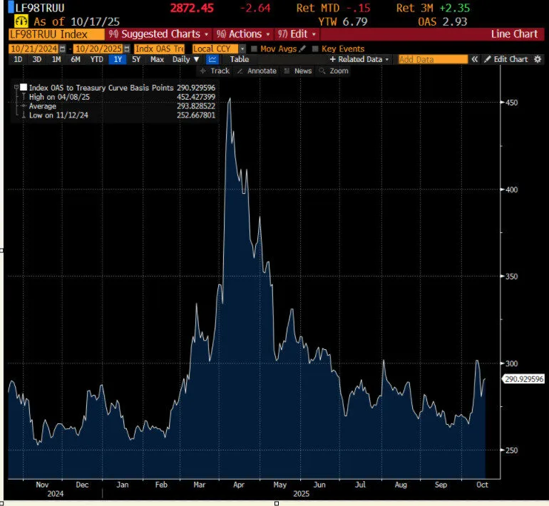 So far at least, credit spreads on US high yield debt (see chart below) have widened so far this month but remain at relatively low historic levels, and are still well below the spikes seen in the early-April tariff concerns.