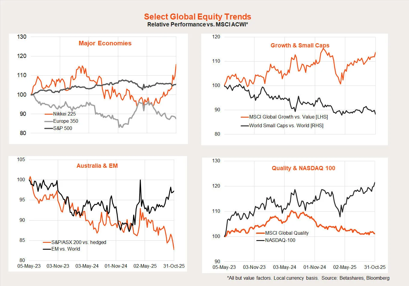 All up, an interesting bifurcation is developing in markets, with the NASDAQ-100 still doing relatively well even though the US market overall is only tracking global market performance. Instead, we’re seeing strong relative performance in Japan and emerging markets, though not Europe or (sadly) Australia.