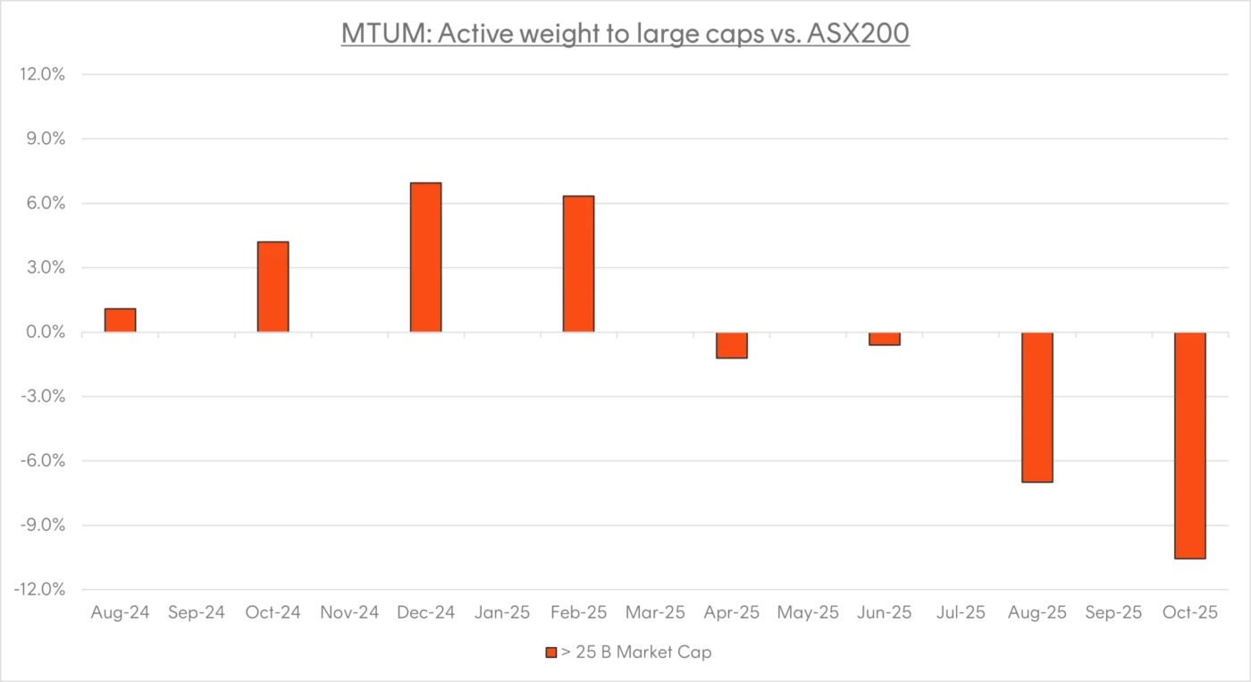 However, 2025 has seen a notable shift in MTUM’s portfolio. The fund has gradually reduced its exposure to large caps, increasing its allocation to mid-caps in response to evolving market dynamics. As at the end of September 2025, MTUM holds a significant underweight in the top 20 names of approximately 10% below the S&P/ASX 200 weights in favour of mid-cap stocks.