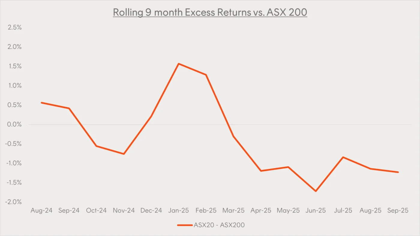 This shift away from large-cap stocks reflects a broader change in market leadership. The chart below illustrates the 9-month rolling excess returns of the S&P/ASX 20 (large caps) vs. the S&P/ASX 200. As shown, the trend in relative performance has started to decline, while year-to-date large caps have underperformed the broader S&P/ASX 200 by -2.92%. Mid-cap stocks (those outside the top 20) have returned 16.43% as measured by the Solactive Australia ex 20 Index outperforming the S&P/ASX 200 by 4.98% over the same time period.