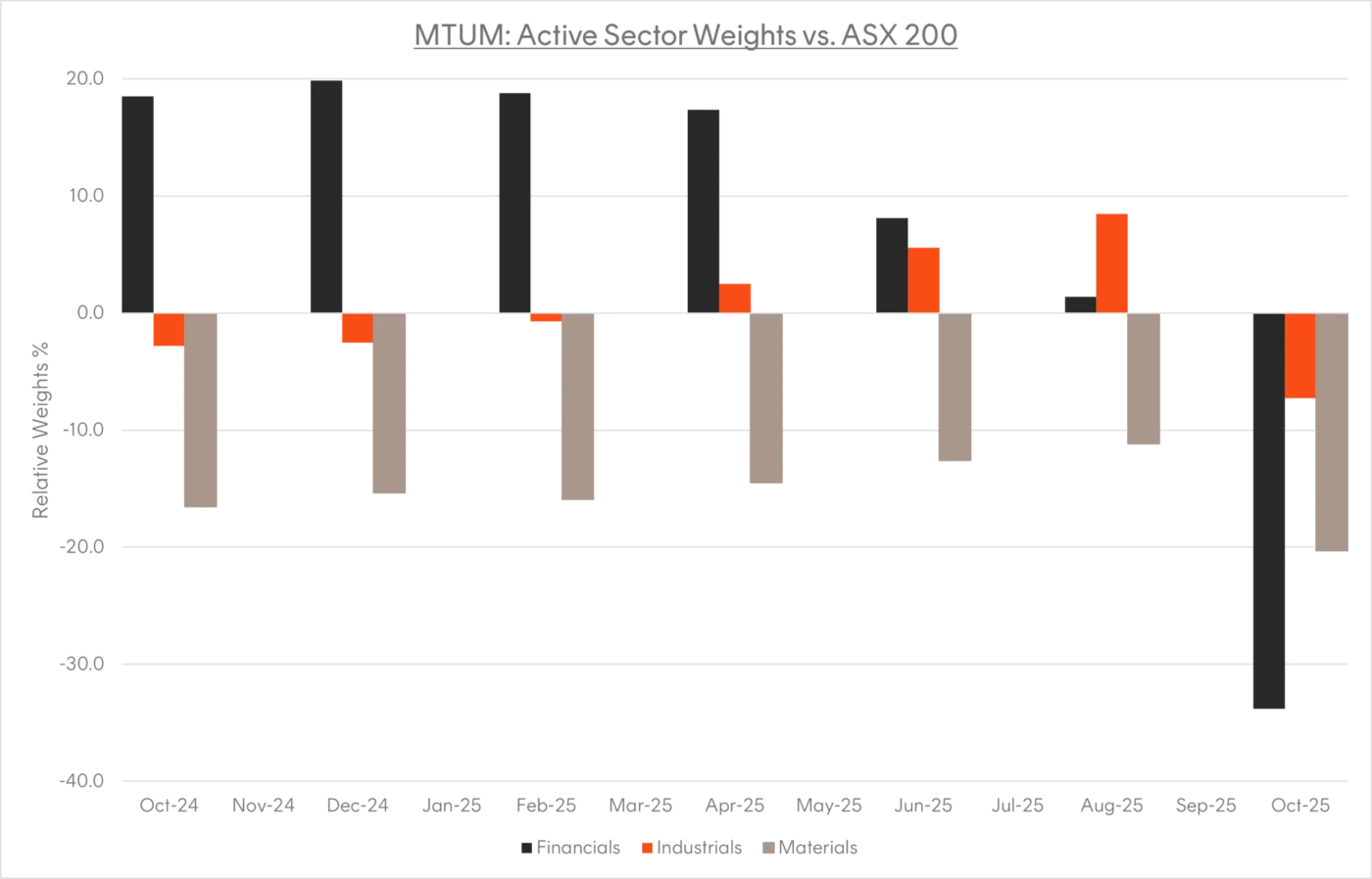 At inception, MTUM established a significant overweight in Financials, reaching nearly 20% above the sector’s representation in the S&P/ASX 200. This positioning reflected strong performance in major banks and financial stocks throughout 2024. However, since early 2025, the allocation to Financials has steadily declined and now sits below the benchmark weight. In contrast, Materials, initially the most pronounced underweight has seen a steady increase in exposure as momentum in this sector strengthened. Meanwhile, Industrials have undergone a notable shift, once underweight, the sector is now MTUM’s most active overweight position, currently sitting nearly 10% above the broader benchmark.