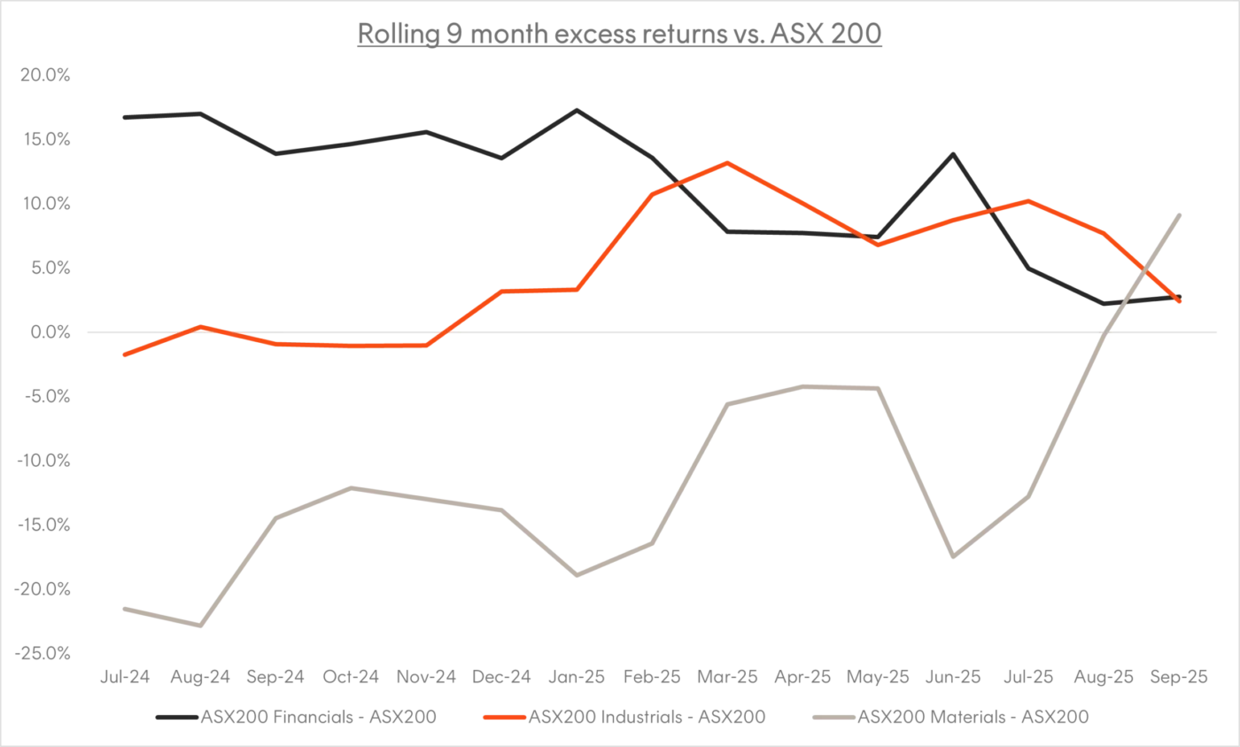 The chart below highlights the 9-month rolling excess returns of key sectors relative to the S&P/ASX 200. As the data demonstrates, Financials have started to trend down, while Materials and Industrials are trending up against the S&P/ASX 200.