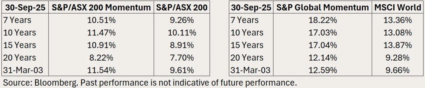 As at 30 September 2025, over the long run, both the S&P/ASX 200 Momentum Index and the S&P Momentum Global Large Mid Cap Index have outperformed their respective broad market cap benchmarks.