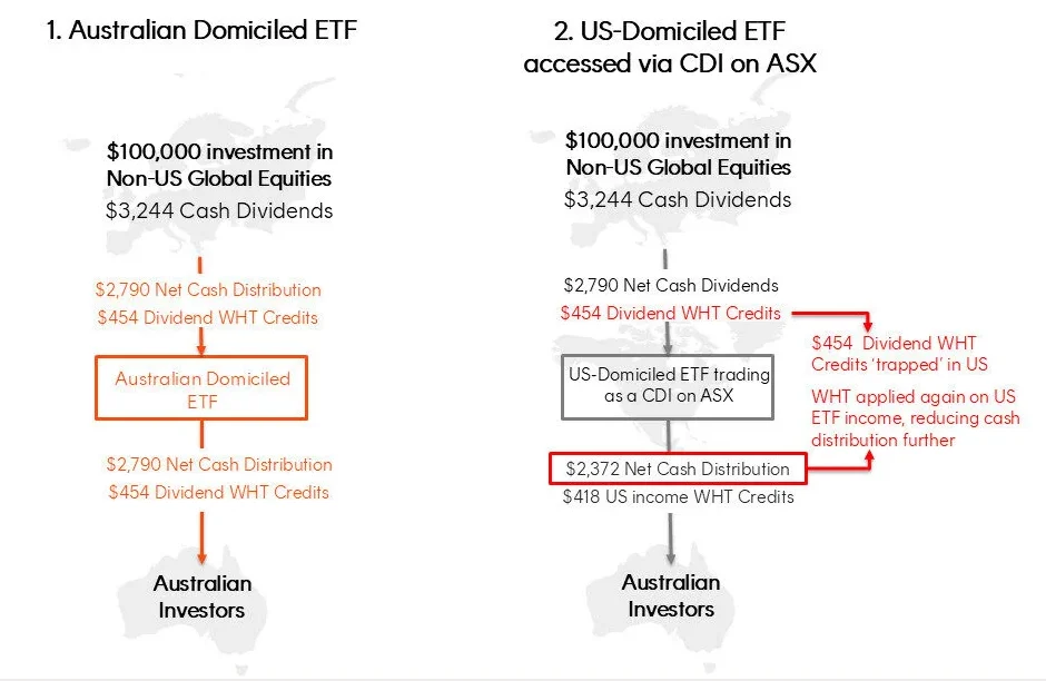 Note: All figures are in Australian dollars, and based on a cash dividend yield of 3.244% for both the non-US Global Equities portfolio and the Australian domiciled ETF. A WHT rate of 14% is applied to non-US sourced income, and a WHT rate of 15% is applied to US sourced income. In the case of the US-domiciled ETF it is also assumed the investor has submitted a W8-BEN.