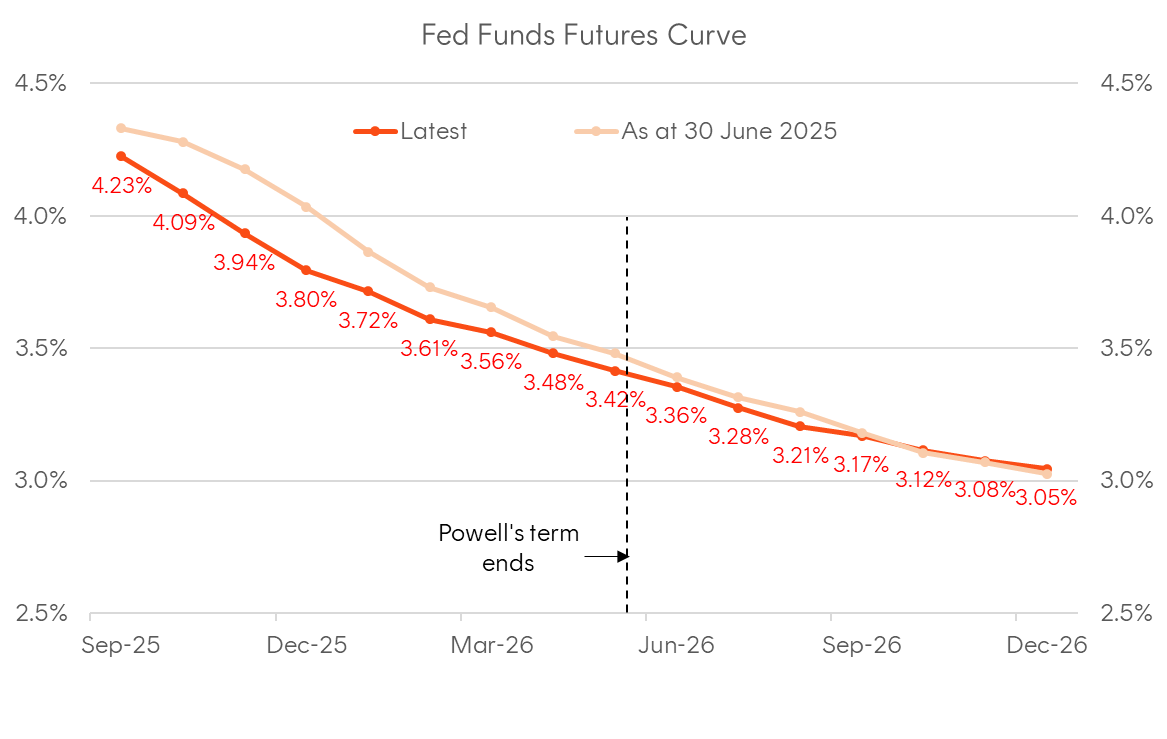 Chart 1: Market implied policy rate expectations (Fed Funds Futures); As at 12 August 2025; Sources: Bloomberg, CME