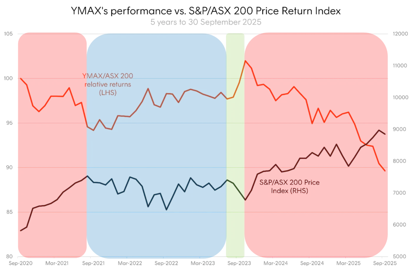 The red highlighted sections of the chart show periods of strong gains for the ASX 200 corresponding with YMAX underperforming (the orange line trending down). The green highlighted section shows a period of market decline corresponding with strong outperformance from YMAX and the blue section illustrates a sideways choppy market corresponding with YMAX’s cumulative relative returns grinding higher against the ASX 200.